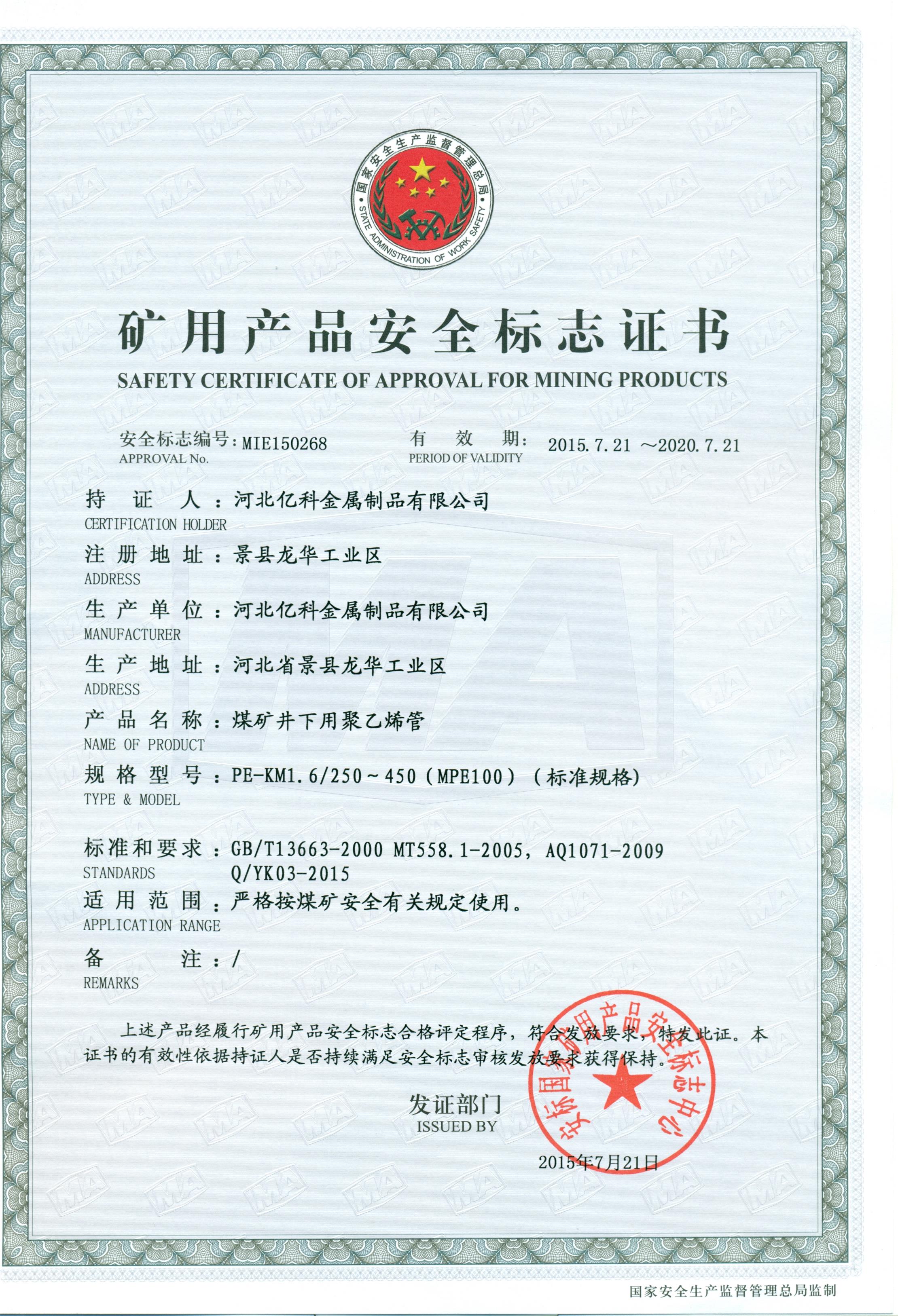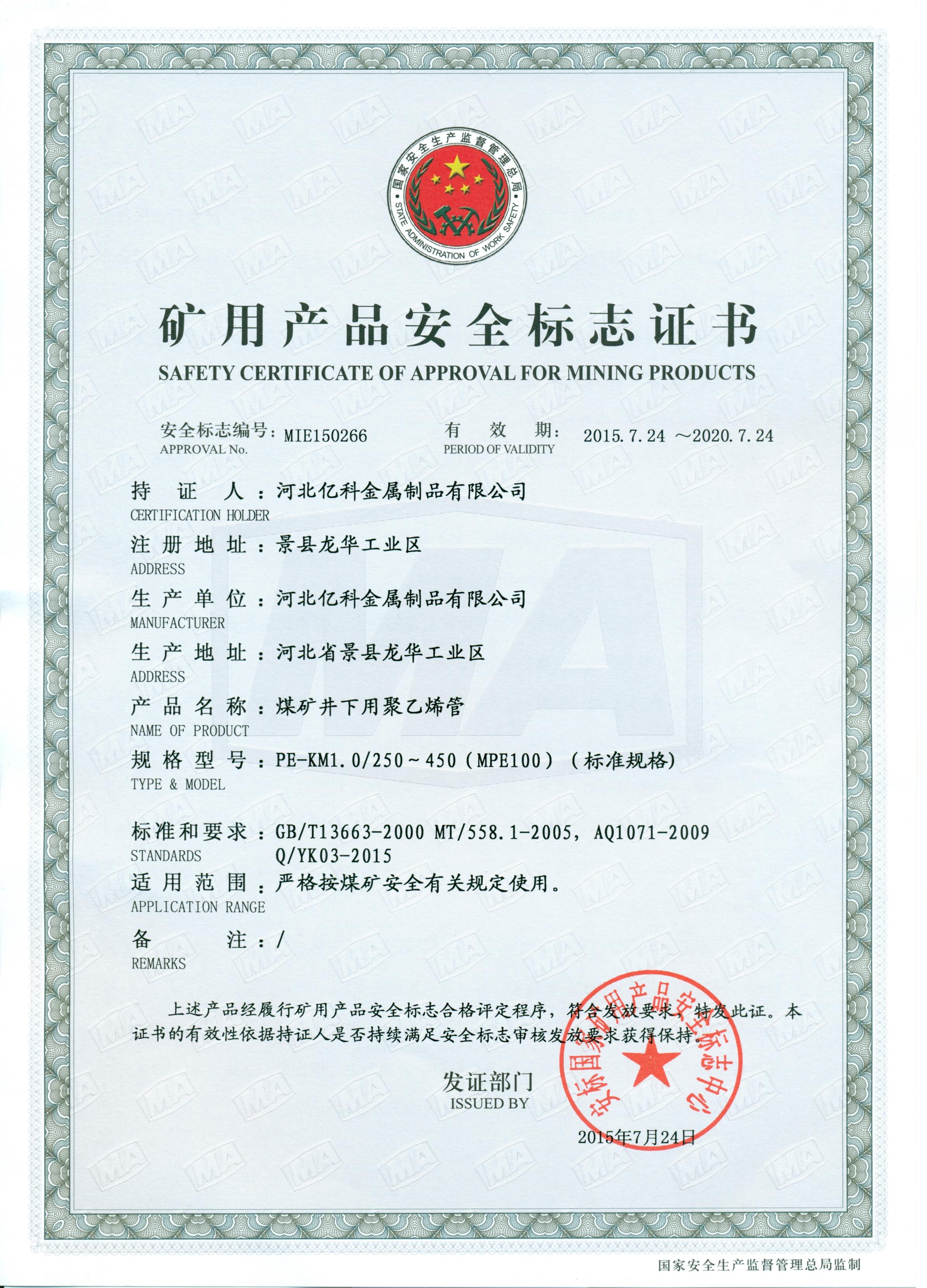 煤矿井下用聚乙烯管煤安证1.0mpa250-450