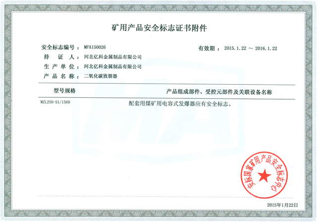 河北亿科金属制品有限公司自主研发出MZL系列二氧化碳致裂器及充灌、检测、连接与起爆等配套装备,可提供二氧化碳致裂技术与成套致裂装备,能满足100MPa~250MPa不同爆破压力和各种工况条件下的应用。